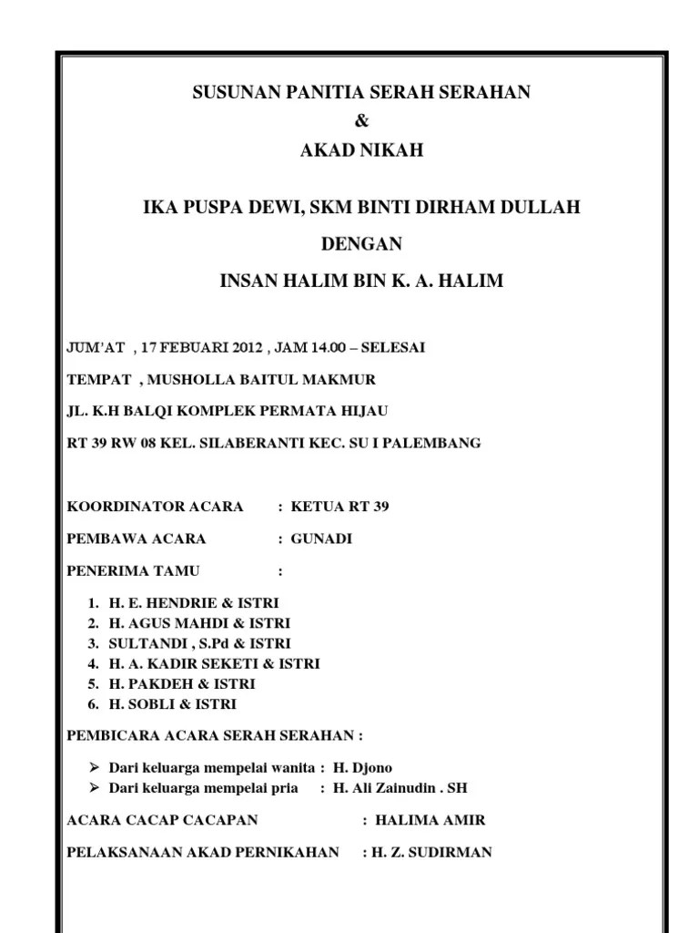 Pembubaran Panitya Resepsi : Contoh Surat Undangan Panitia Resepsi Pernikahan Contoh Surat : Digelar upacara pernikahan juga turut menikmati jenang itu.